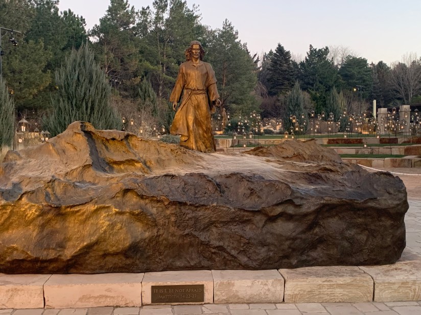 My photos of Dasher and Prancer weren’t the best, but this majestic reindeer informs you there are just ahead! The best part though was the one exhibit that is NOT a holiday themed one. This is available to see year-round and if you are ever in the Salt Lake area, I highly recommend you take the trip to see it. The appropriately titled exhibit is called Light of the World. There are several statues made and placed throughout your walk that go through different events in the life and ministry of Christ Jesus. The attention to detail is phenomenal. The spot of Lazarus being called out of the tomb, if you travel behind it to stand directly behind Lazarus, you see plainly Christ calling with a light illuminating over Him. (While I don’t remember that from the Bible story, the image is nonetheless powerful) The imagery of the chicks hiding beneath the mother hen as Christ is gathering is moving, and the spot of Christ beckoning Thomas to come and see with the blemished skin very visible to where it was pierced, superb event.